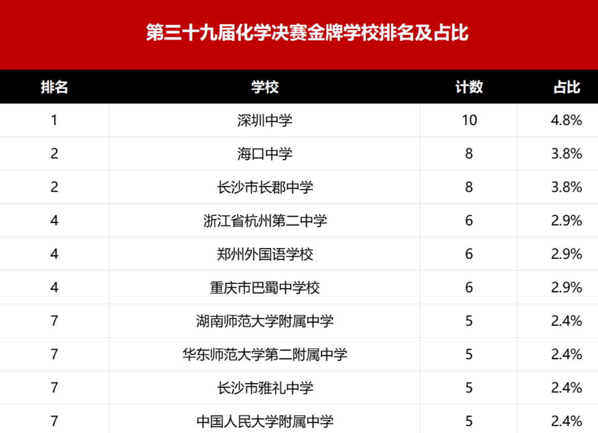 第39届中国化学奥林匹克(决赛)金牌头部学校